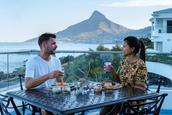 863721252 A couple enjoying a delightful breakfast while overlooking the iconic Table Mountain in Cape Town. A perfect start to a memorable vacation filled with scenic beauty and local flavors.