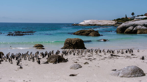 866138442 Strolling along Boulders Beach in Simons Town, watch lively African penguins interacting on sandy shores of Cape Town, South Africa..