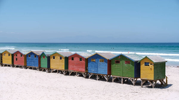 864575186 Brightly colored beach huts stand proudly along the picturesque Muizenberg beach. Cape Town South Africa
