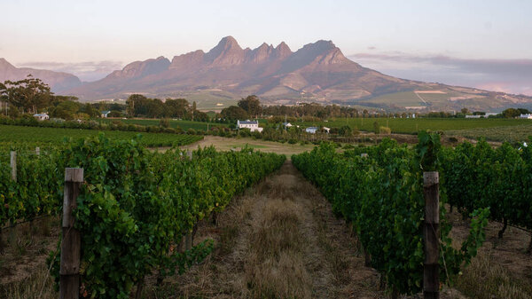862795550 Wander through the lush vineyards of Stellenbosch as the sun sets behind the majestic mountains. Experience the beauty of South Africas wine country, perfect for a memorable holiday.