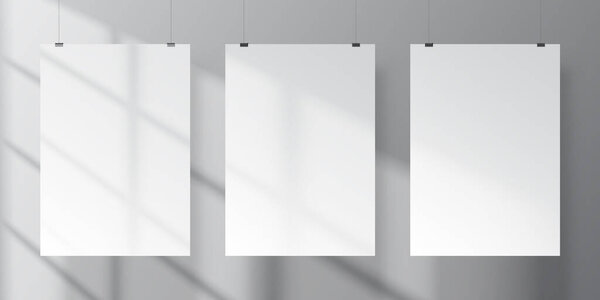 865075738 Realistic vector mockup of three white vertical A4 posters with soft shadows of window inside empty minimalistic interior. Print or product presentation template
