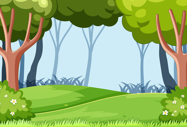 866865088 Bright vector forest scene with leafy trees, grassy hills, and soft natural lighting effects