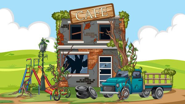 868507244 Cartoon vector of derelict countryside cafe with broken windows, overgrown plants, rusty playground equipment