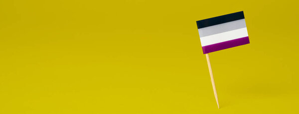 633527926 An asexual pride flag attached to a pole stans on a yellow background, in a panoramic format to use as web banner or header