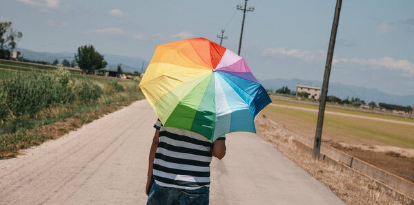727692886 Closeup of a man, seen from behind, walking by a lonely road in a natural landscape, carrying an open rainbow umbrella on his shoulders, in a panoramic web banner format