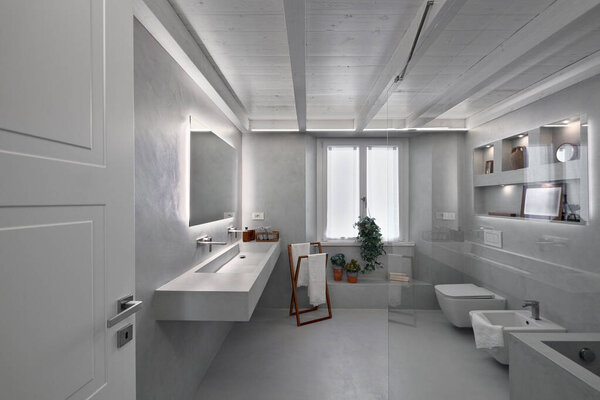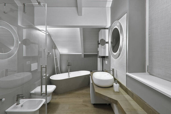 642629870 Internal view of a modern bathroom in the attic with a freestanding bathtub and shower box, to the right the countertop washbasin on the wooden top, the floor is in parquet