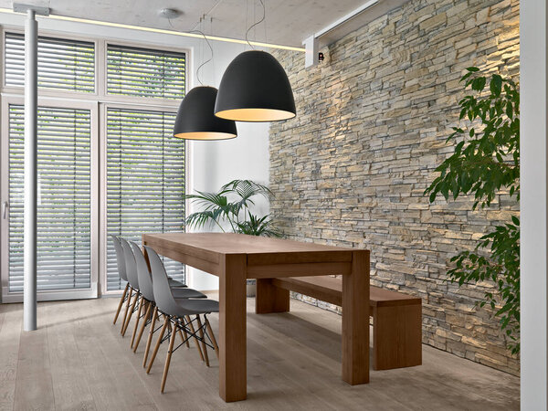 642630626 Interior of the modern living room in the foreground there is a dining table behind wich there is a stone wall, the floor is made of wood