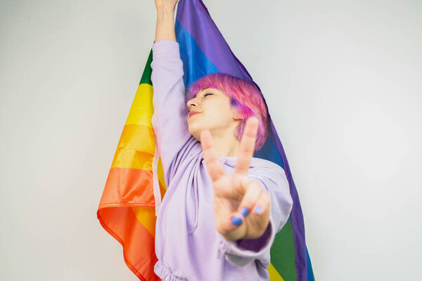 720923180 A woman with pink hair is holding a rainbow flag. She is smiling and she is happy. LGBT young woman holding LGBT flag on white background