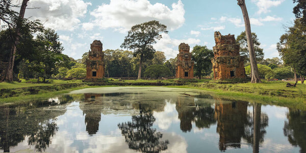 864806676 Serene reflection of three Angkor Thom Prasat Suor Prat towers mirrors in a calm pond amid tropical lawns and trees. Concept, high quality travel stock for editorial use, destination marketing and