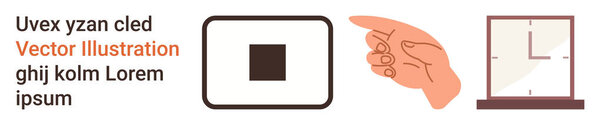 855268328 User interface, time management, digital interaction, innovation design, iconography, technology. A hand pointing, a clock icon and square symbols arranged linearly. User interface and time