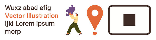 859613738 Problem-solving, navigation, creativity, conceptual thinking, teamwork, graphic design. A person holding a purple puzzle piece next to a location pin and a square frame. Problem-solving