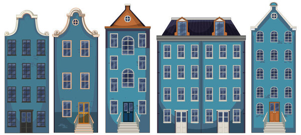 839071694 Five blue Dutch townhouses in flat vector style, symmetrical composition, clean lines, muted palette