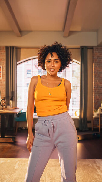 720631782 Vertical Screen: Beautiful Young Black Female Record a Dancing Routine on a Smartphone Video for Social Media. Stylish Latin Girl Streaming Her