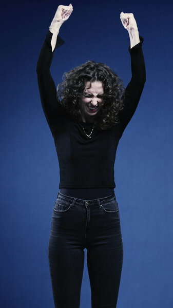 692717788 Woman Exulting in Success with Upward Fist, Blue Background in Vertical Orientation