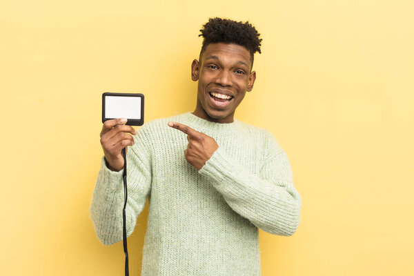 547835560 Black afro young man looking excited and surprised pointing to the side. accreditation pass id concept