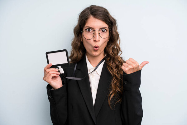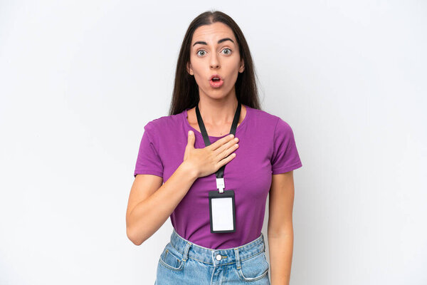 768522030 Young caucasian woman with ID card isolated on white background surprised and shocked while looking right