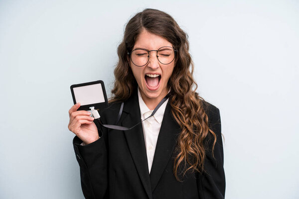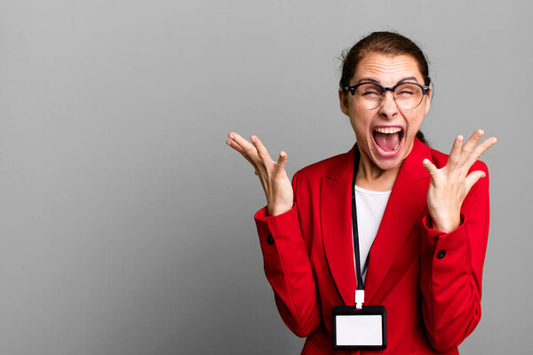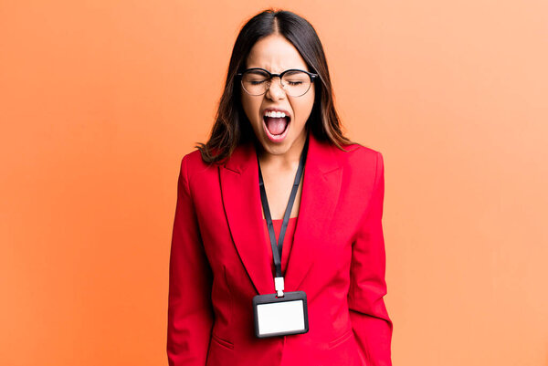 635389876 Hispanic pretty woman shouting aggressively, looking very angry with an accreditation card pass