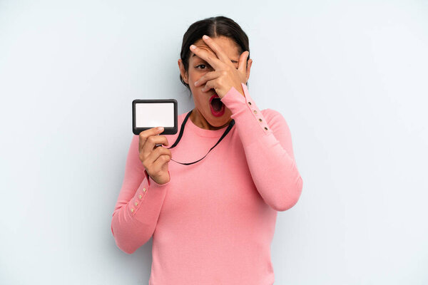 584619350 Hispanic woman looking shocked, scared or terrified, covering face with hand. vip pass card