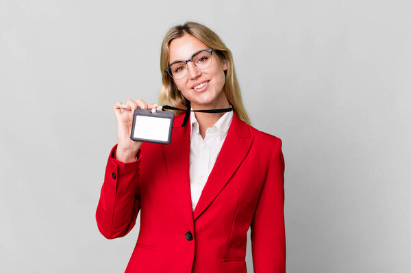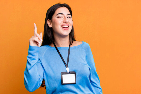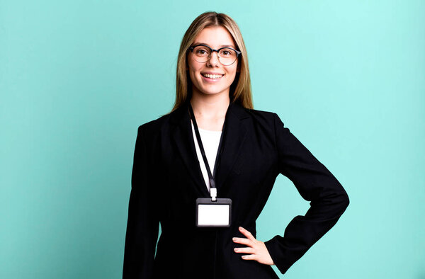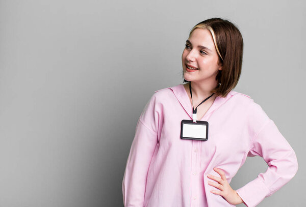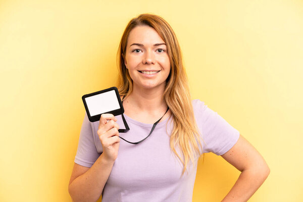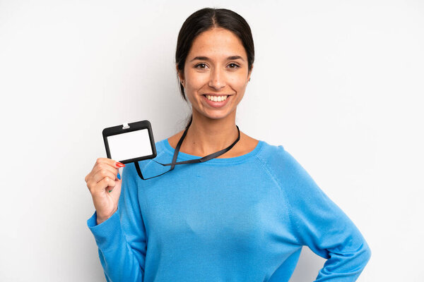 656832146 Young pretty woman smiling happily with a hand on hip and confident. id card accreditation concept