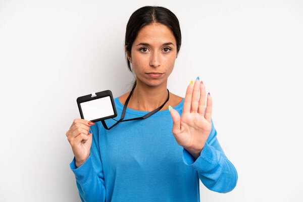 589577364 Hispanic pretty woman looking serious showing open palm making stop gesture. vip pass card id
