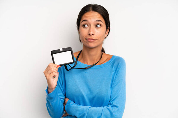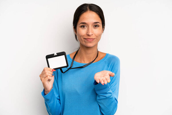 589578038 Hispanic pretty woman shrugging, feeling confused and uncertain. vip pass card id