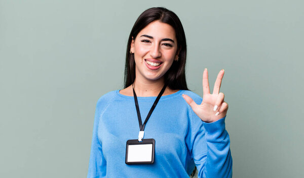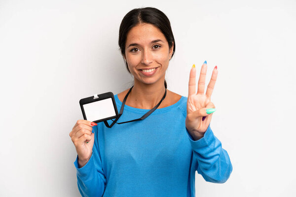 589578078 Hispanic pretty woman smiling and looking friendly, showing number three. vip pass card id