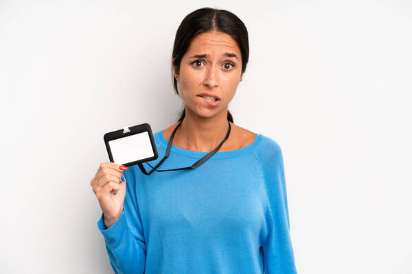 589579112 Hispanic pretty woman looking puzzled and confused. vip pass card id