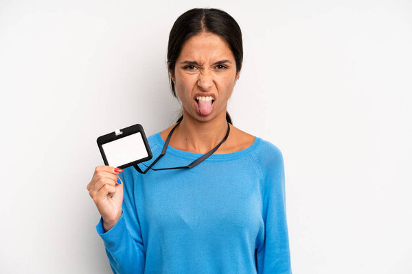 589579126 Hispanic pretty woman feeling disgusted and irritated and tongue out. vip pass card id