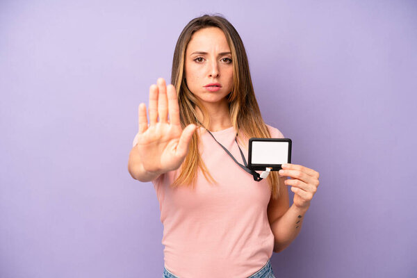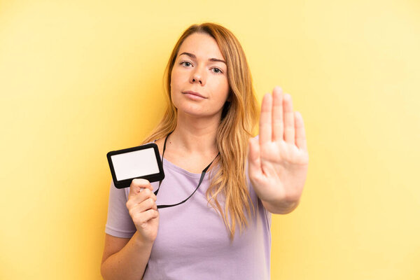 593397774 Pretty caucasian woman looking serious showing open palm making stop gesture. vip pass id card concept