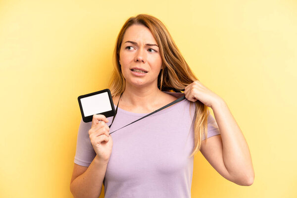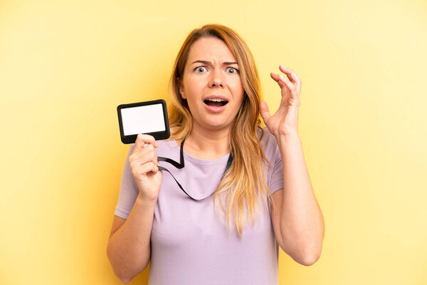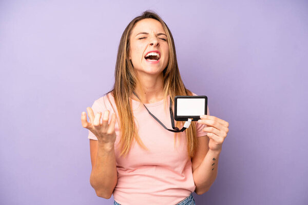 593398002 Pretty caucasian woman looking desperate, frustrated and stressed. vip pass id card concept