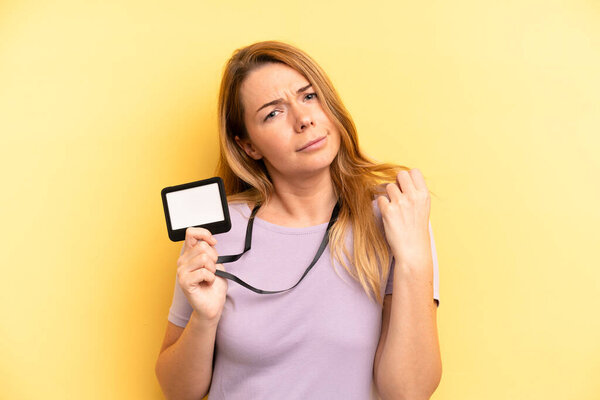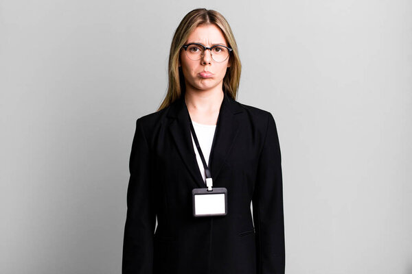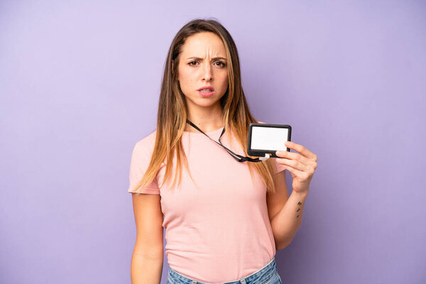 660797060 Young pretty woman feeling sad and whiney with an unhappy look and crying. id card accreditation concept