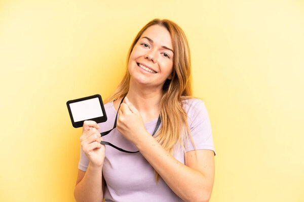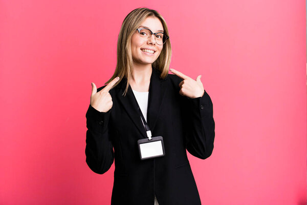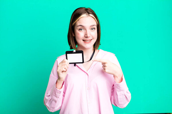 634116200 Young pretty woman smiling confidently pointing to own broad smile. id card accreditation concept