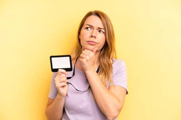 589603520 Pretty blonde young woman thinking, feeling doubtful and confused. vip pass card concept