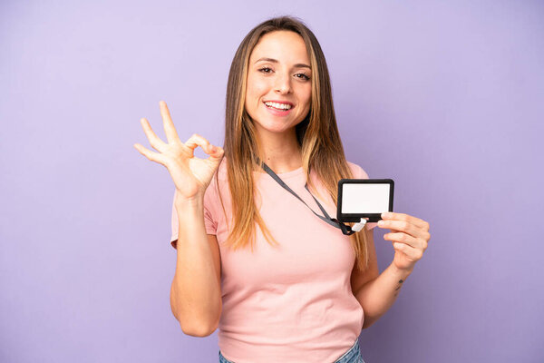 593397762 Pretty caucasian woman feeling happy, showing approval with okay gesture. vip pass id card concept