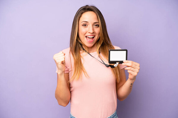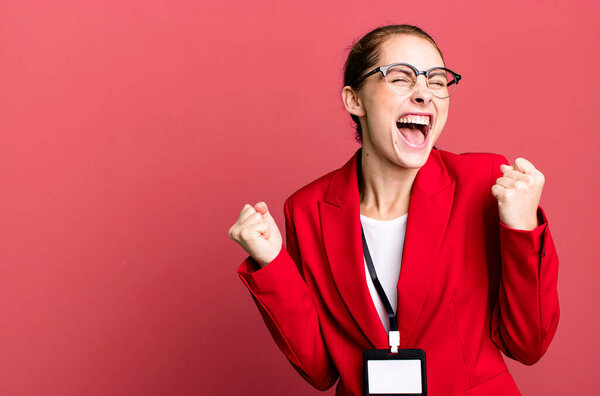 593397764 Pretty caucasian woman feeling shocked,laughing and celebrating success. vip pass id card concept