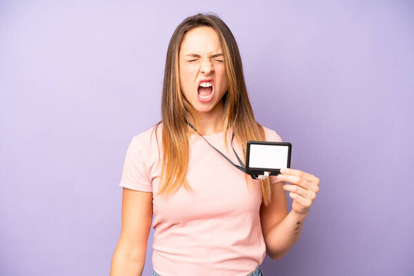 593397942 Pretty caucasian woman shouting aggressively, looking very angry. vip pass id card concept