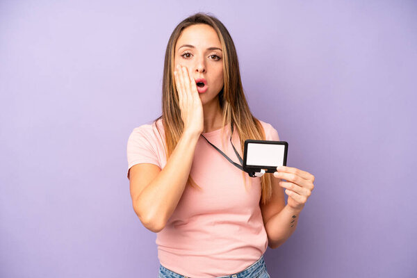 593397956 Pretty caucasian woman feeling shocked and scared. vip pass id card concept