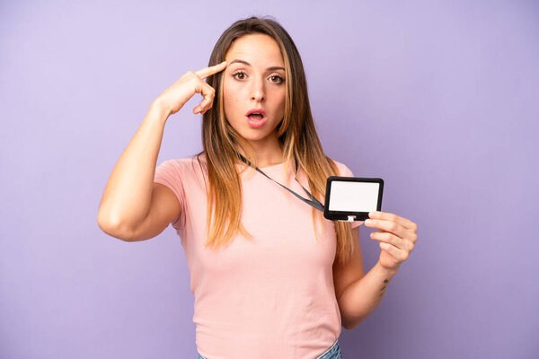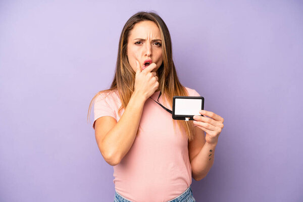593397968 Pretty caucasian woman looking surprised, realizing a new thought, idea or concept. vip pass id card concept