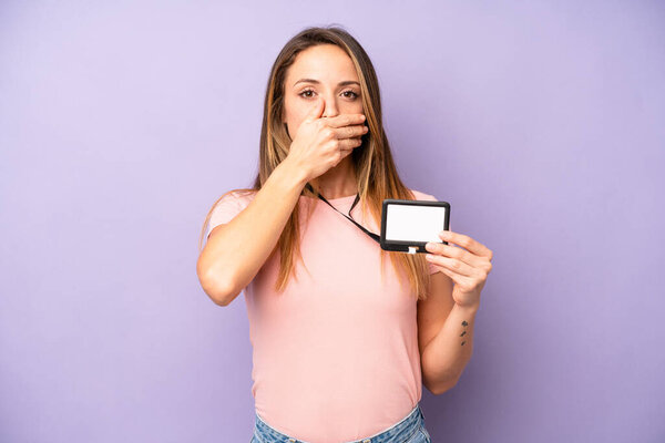 593398088 Pretty caucasian woman covering mouth with hands with a shocked. vip pass id card concept