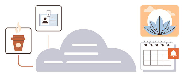 851876290 Central cloud connects steaming coffee, ID badge, scenic plant imagery, and reminder calendar. Ideal for productivity, workflows, mindfulness, scheduling, data integration remote work or digital