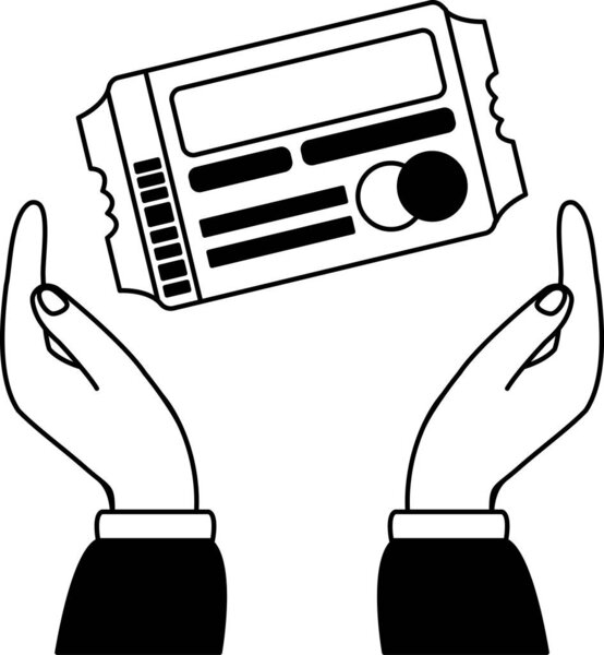 858323374 Black and white illustration of two hand are holding a ticket in the air