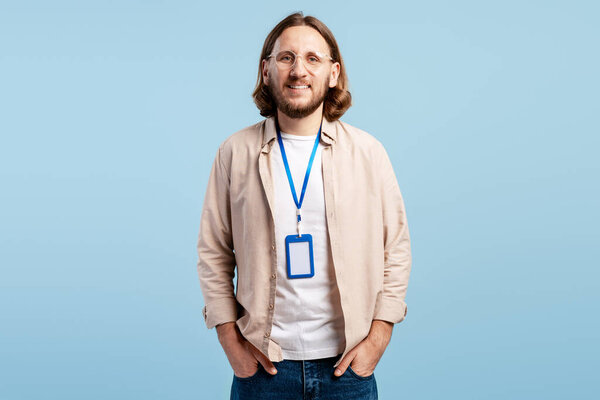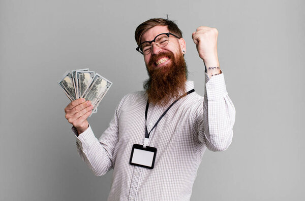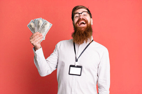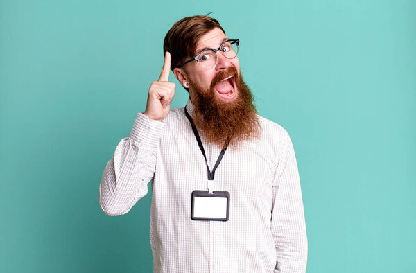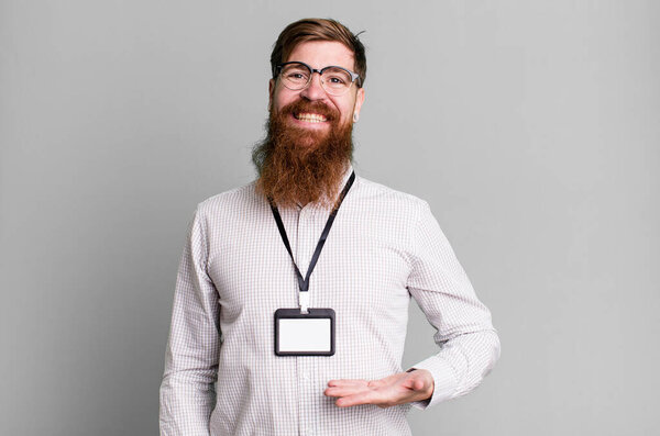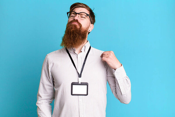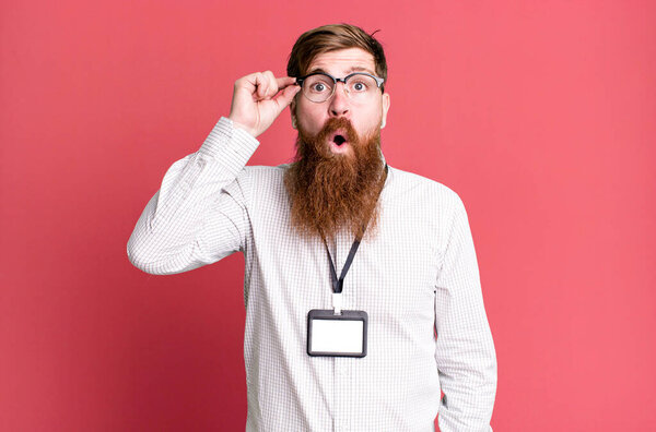 647042506 Young adult red hair bearded cool man with a vip pass accreditation card