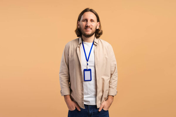 857095256 Male employee posing wearing an identity badge, representing business, teamwork, and entry