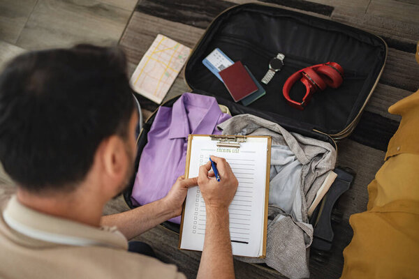 847822934 Traveler checking packing list while preparing suitcase for a trip