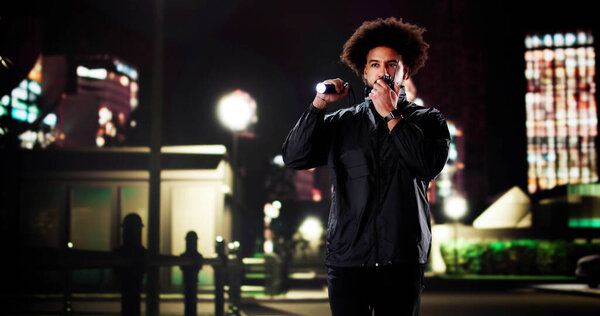 801480972 Late Night Security Guard Patrolling the Building Perimeter with Flashlight