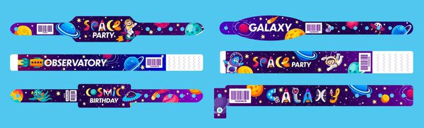 842397308 Kids space party wristband bracelets, event pass, hand bracelets for entrance, . Vector set of celestial-themed cosmic band mockups with aliens, rockets and astronauts for an interstellar experience