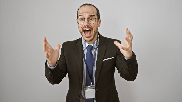 736103270 Excited man in business attire gestures with hands on white background