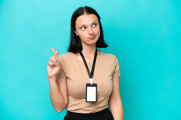 701777130 Young caucasian woman with ID card isolated on blue background with fingers crossing and wishing the best