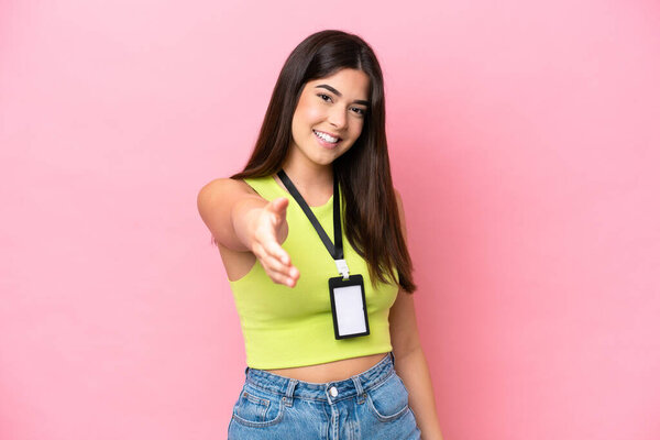 710417910 Young Brazilian woman with ID card isolated on pink background shaking hands for closing a good deal