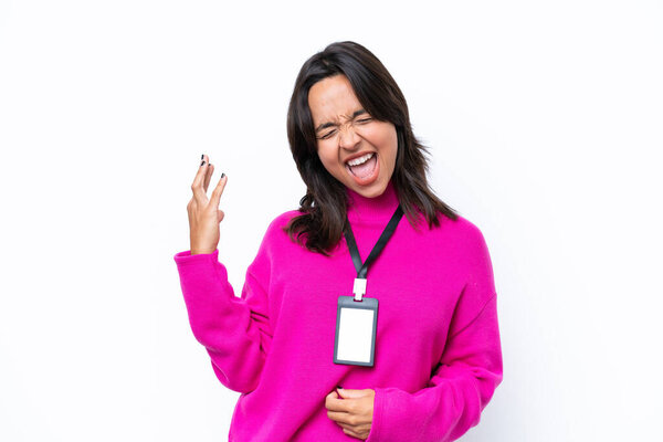 732350678 Young hispanic woman with ID card isolated on white background making guitar gesture